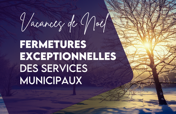 Nous vous informons que la mairie sera fermée les 25 décembre 2025 ainsi que les 1er et 2 janvier 2026. Les horaires des services municipaux seront exceptionnellement aménagés les mercredis 24 décembre et 31 janvier.