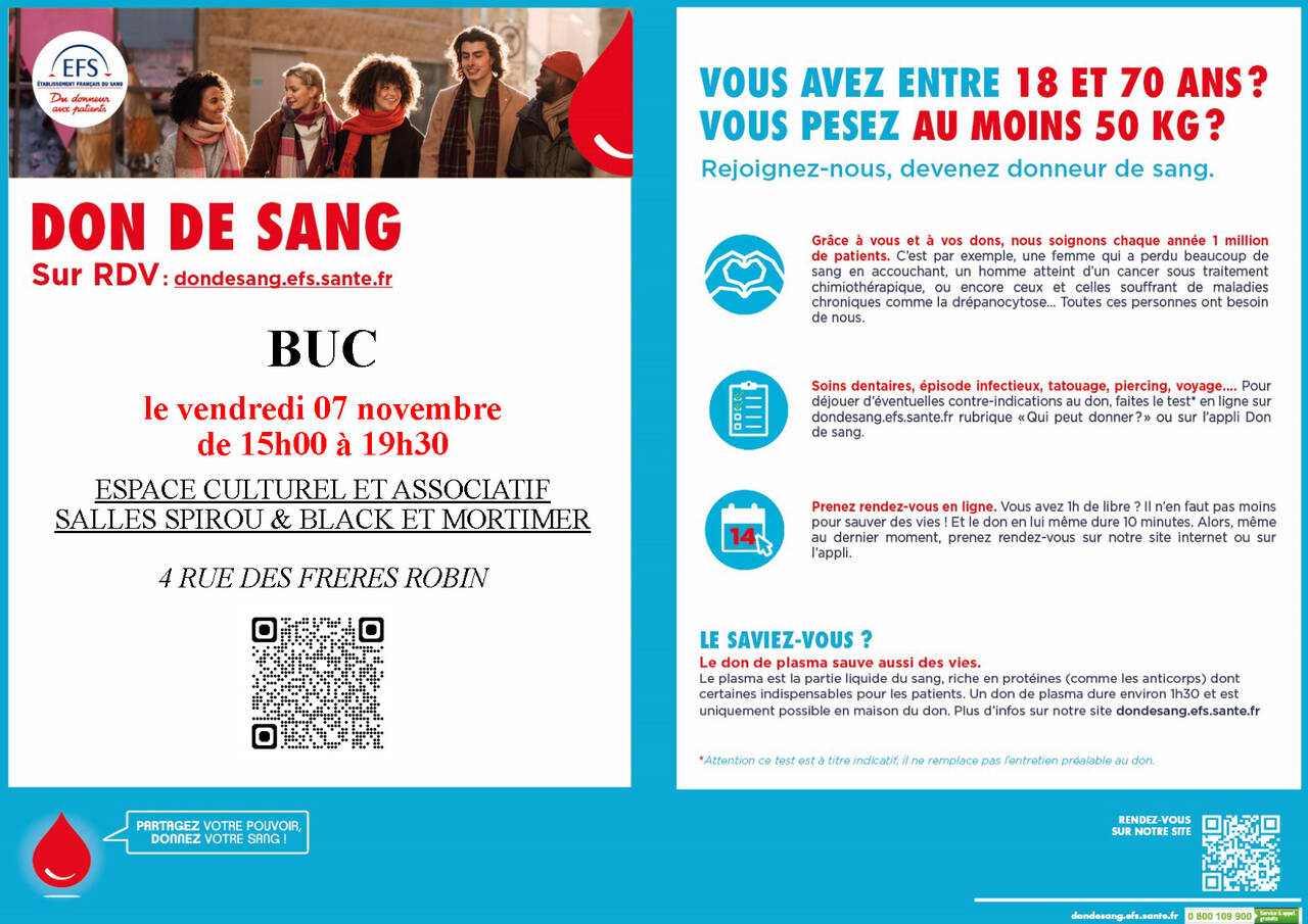 L'Établissement Français du Sang (EFS) organise une collecte de sang à Buc !