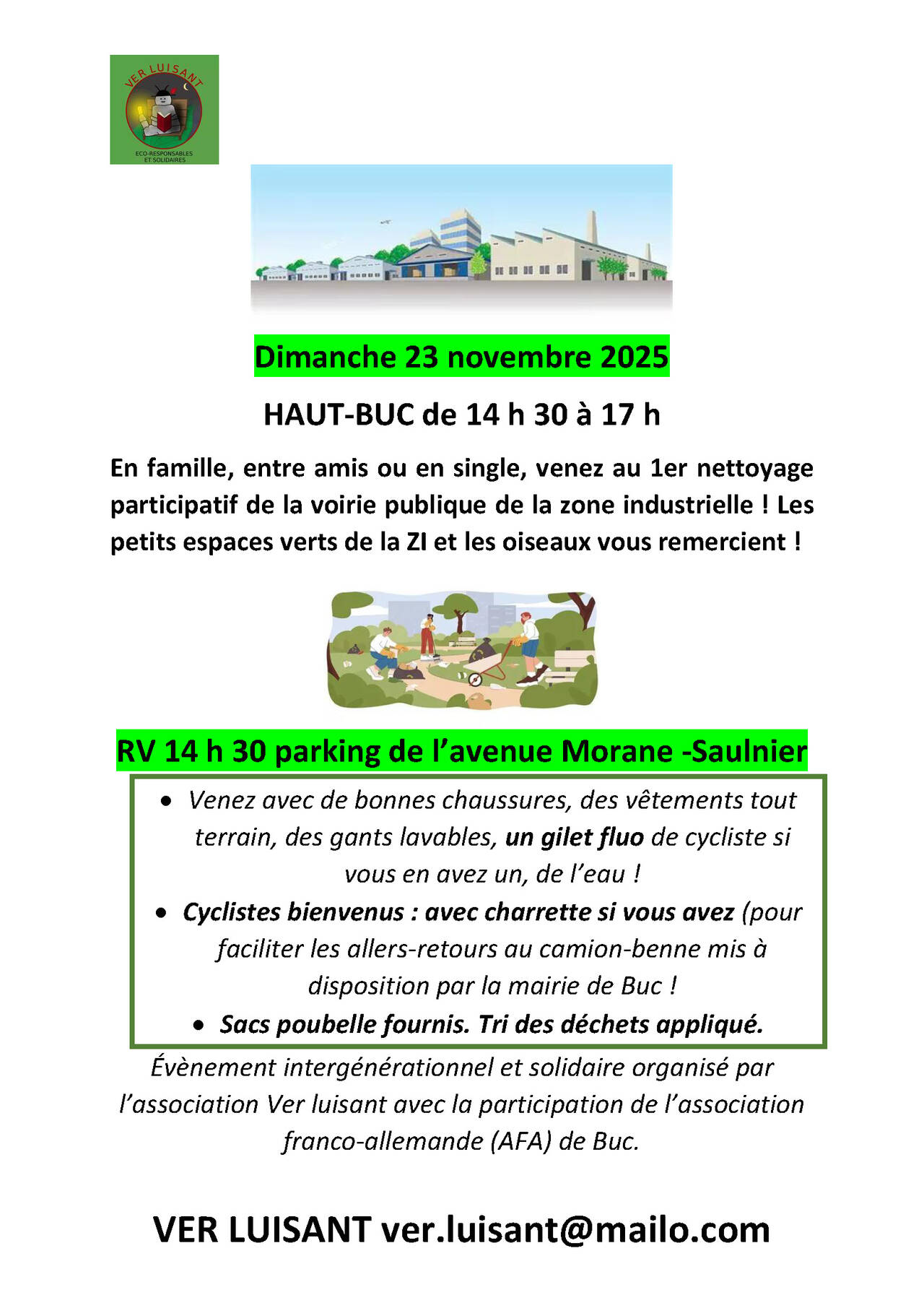 En famille, entre amis ou en single, venez au 1er nettoyage participatif de la voirie publique de la zone industrielle ! Les petits espaces verts de la ZI et les oiseaux vous remercient.