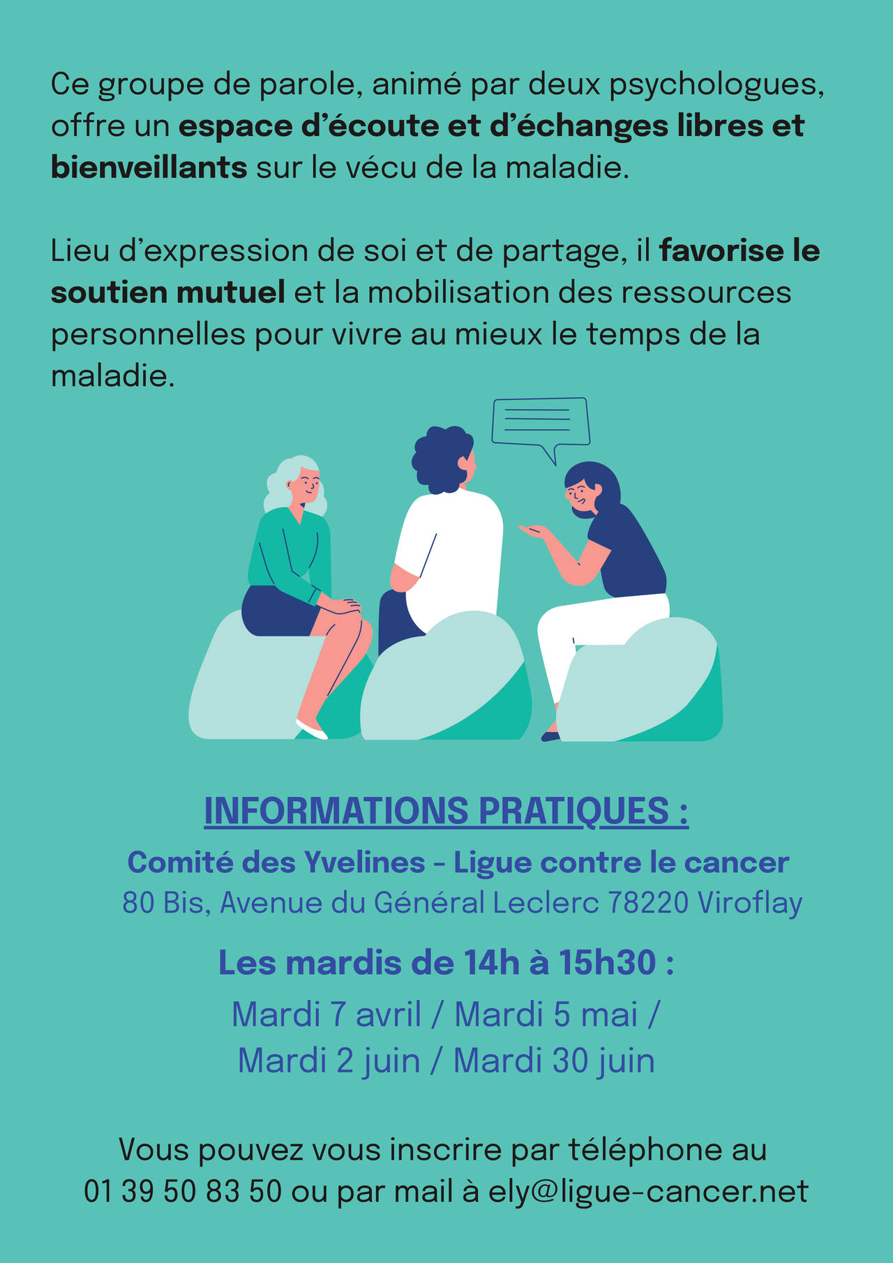 La Ligue contre le cancer – comité des Yvelines propose un groupe de parole destiné aux personnes touchées par la maladie.