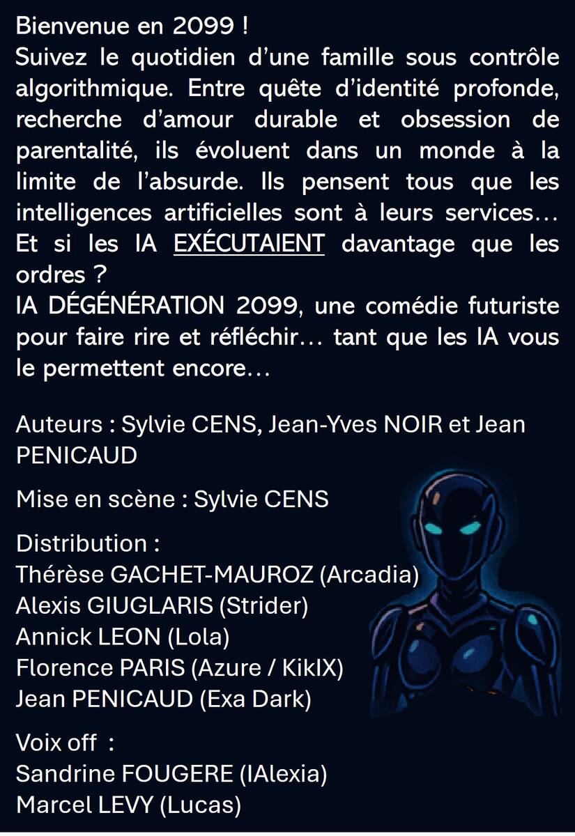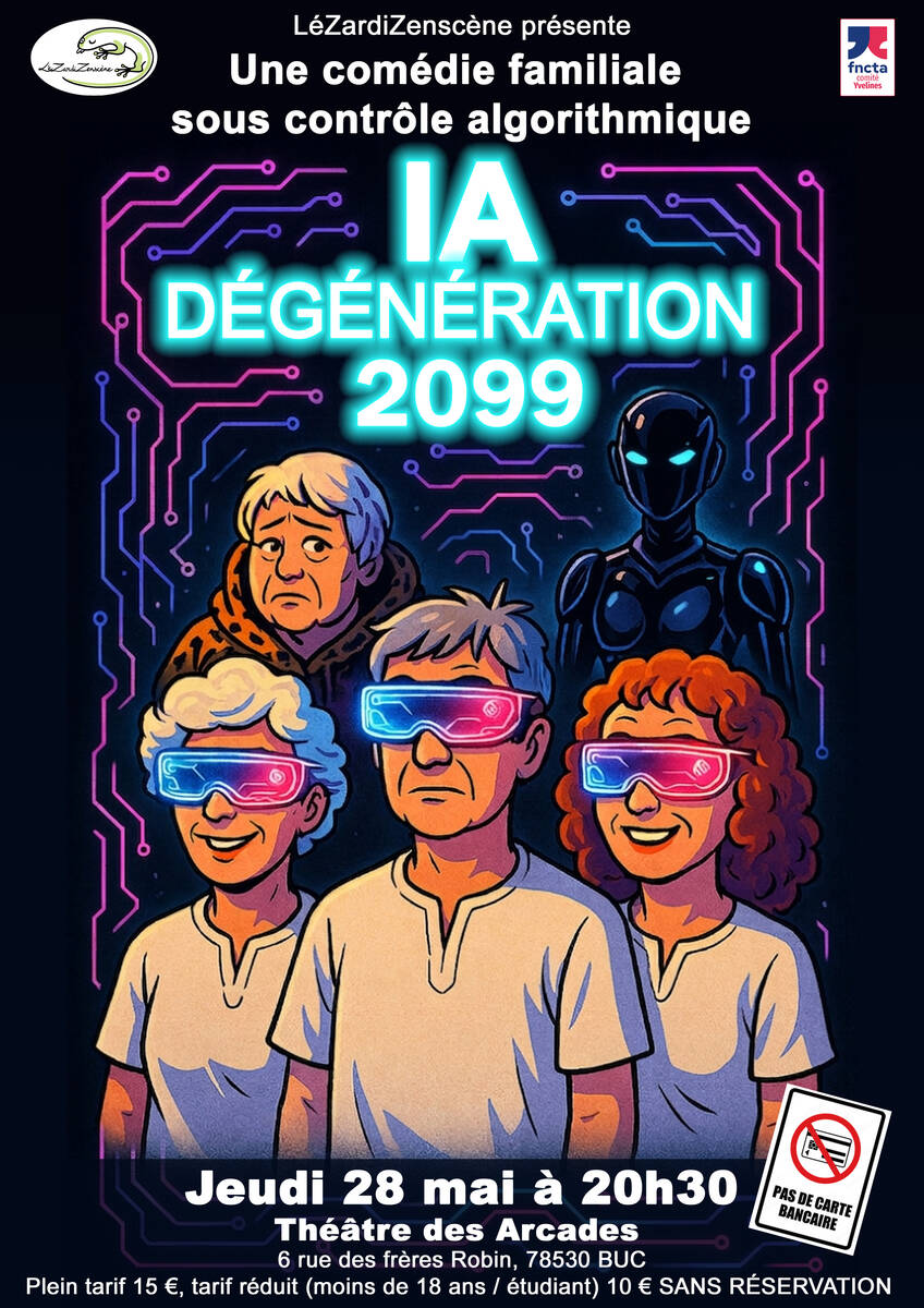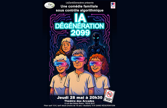 L’association LéZardiZenscène vous invite à assister à son nouveau spectacle « IA dégénération 2099 », une comédie familiale sous contrôle algorithmique, présentée au Théâtre des Arcades de Buc.